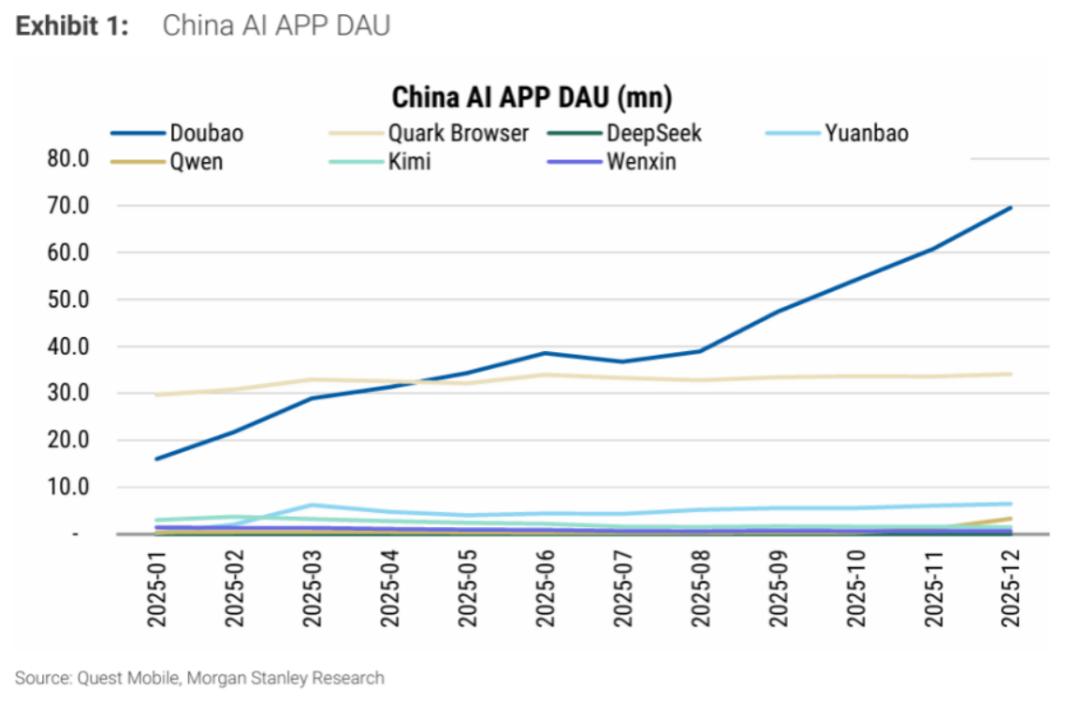 但在更能体现用户粘性的日活表现上,豆包依然领先。根据Quest Mobile数据,截至2025年12月,在仅App渠道的DAU规模上,豆包约为7000万,腾讯元宝在1000万以下,千问则尚未达到500万。