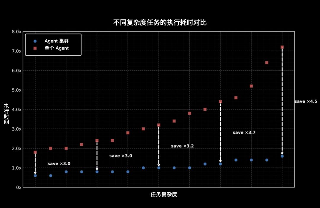 相较于单智能体执行模式,智能体集群能将实现目标性能所需的最少关键步骤缩减3至4.5倍,且目标要求越高,步骤的节省幅度就越大;