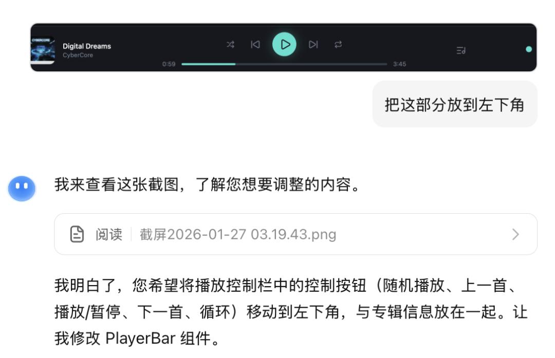 拿刚才生成的音乐播放器网页来说,我想让它调整一下播放器的布局,于是截了个图,圈出播放器的主体部分;