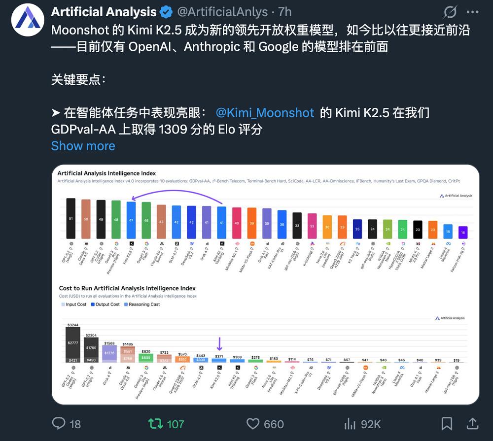 发布后2天左右,Kimi K2.5获得权威AI评测榜单Artificial Analysis开源模型第一的成绩,仅次于来自OpenAI、Anthropic和谷歌的4款模型。