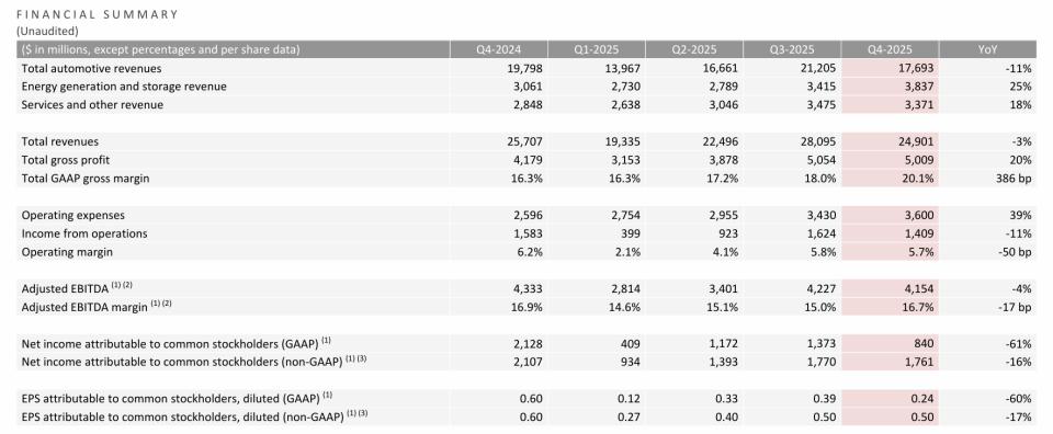 当地时间1月28日,特斯拉公布了2025年第四季度及全年财务报告。数据显示,该公司第四季度实现营收249亿美元,同比微降3%,略高于市场预期;调整后每股收益为0.5美元,超出分析师预期。