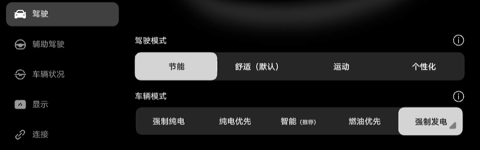 1. 中控屏点击设置 > 驾驶 > 车辆模式 > 强制发电