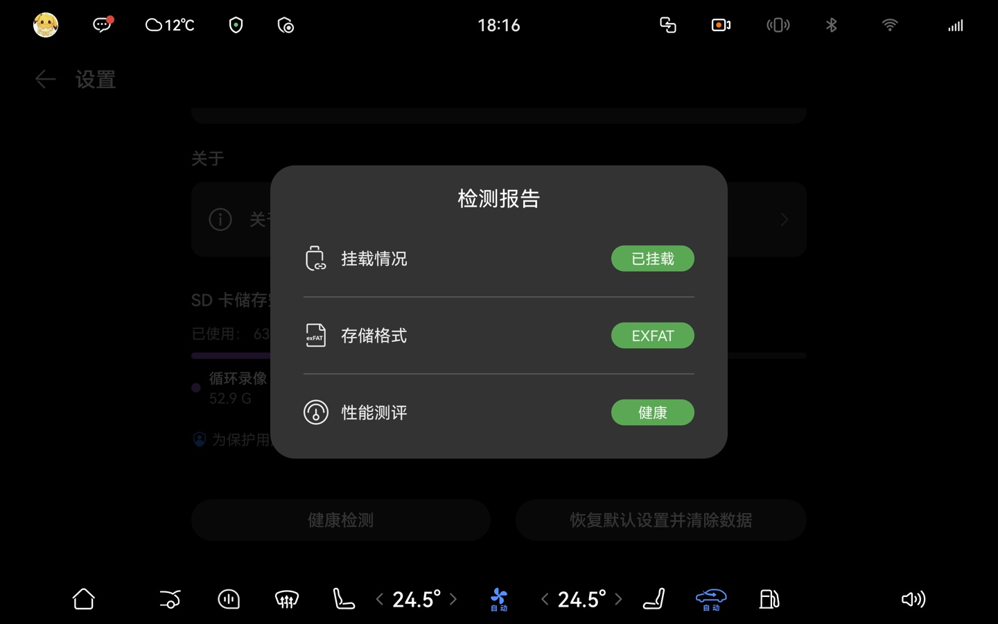 ● 行车记录仪新增存储设备异常提醒与存储设备健康度检测功能当 SD 卡 / U 盘插入时,车辆将自动开始检测 SD 卡 / U 盘的健康度,并给出检测报告;检测到异常时,将会弹出异常提示