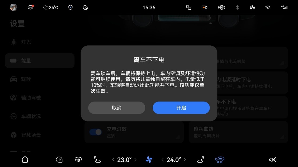 1. 中控点击设置 > 能量 > 离车不下电,开启离车不下电