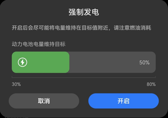 3. 弹窗内拉动滑动条设置“动力电池电量维持目标”,设置完成后点击“开启”按钮,开启强制发电模式