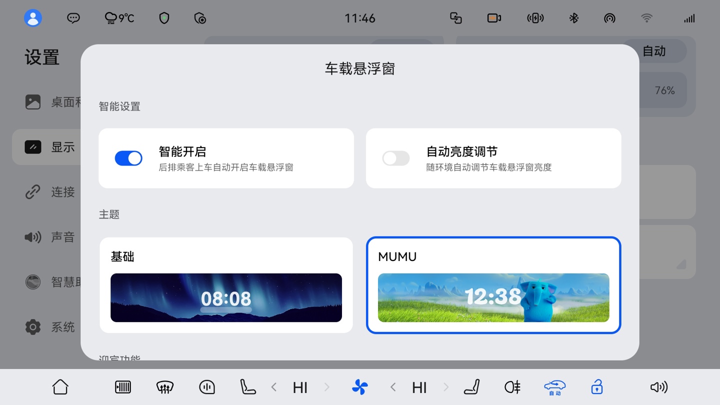 功能使用方法 / 打开路径:中控点击设置 > 显示 > 车载悬浮窗 > 智能开启