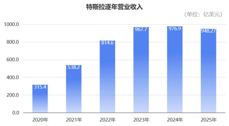 2025年全年,公司总营收为948.27亿美元,同比下降3%,这还是特斯拉自2010年上市以来,首次出现营收下滑。