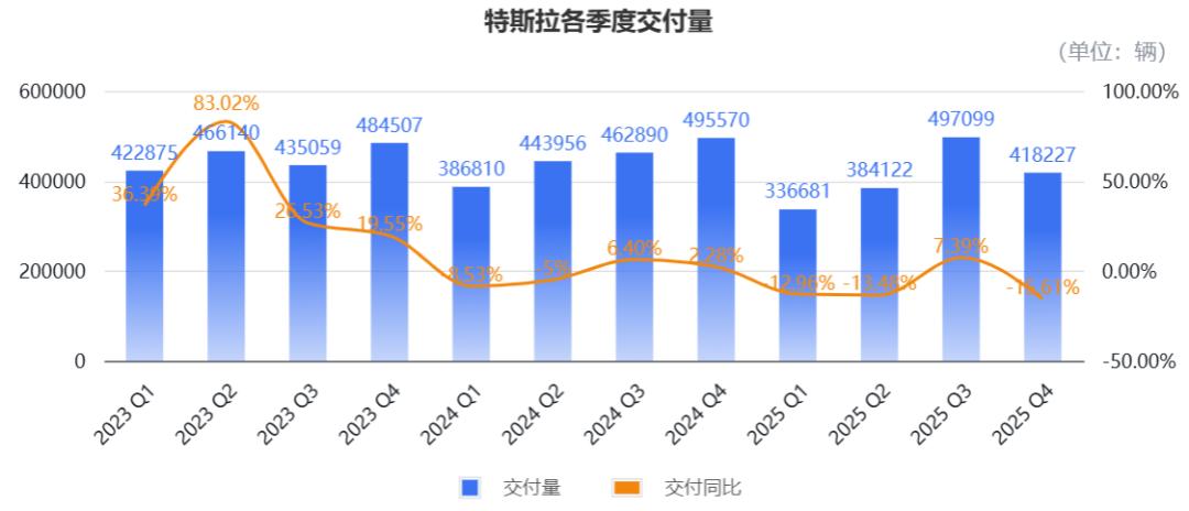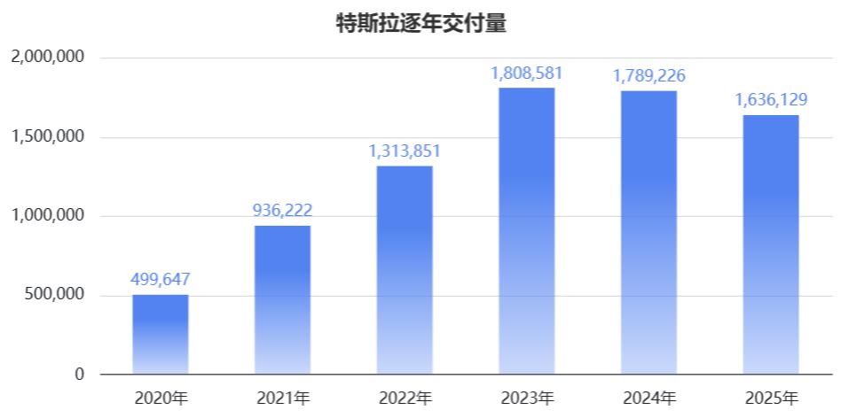 直观看数据:2025年,特斯拉总交付量连续两年下降,营收出现上市以来的首度下滑,全年净利润几乎腰斩。