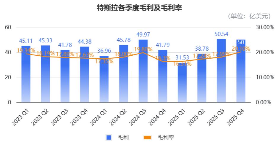 利润层面,特斯拉毛利水平有所提升,第四季度的综合毛利为50亿美元,毛利率回升到20.1%,汽车毛利率为15.4%。