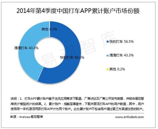 与快的强强联合后,滴滴一跃成为网约车赛道的霸主。易观智库统计的数据显示,2014年Q4,滴滴打车市占率为56.5%,快的打车市占率为43.3%,合计高达99.8%。
