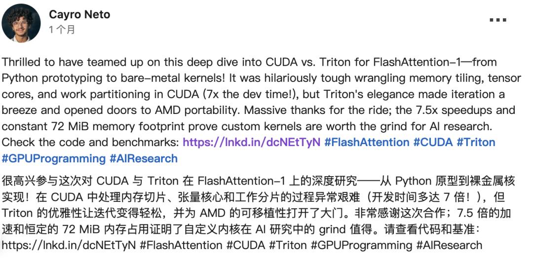 开发者实测,在Transformer注意力内核等场景,代码量比CUDA减少75-90%,性能媲美甚至局部超CUDA 5-37%。