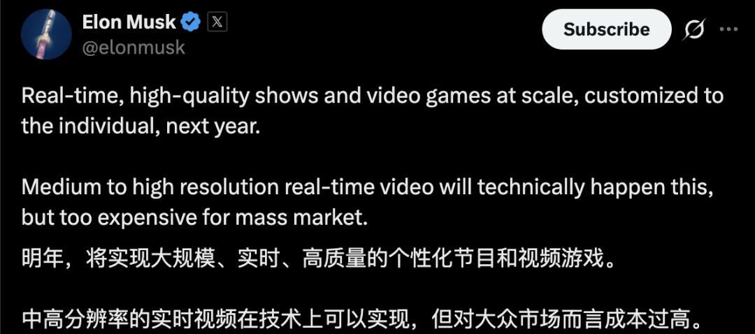xAI的掌门人马斯克已经放话,承诺明年就要实现「大规模、实时、高质量的个性化节目和视频游戏」。