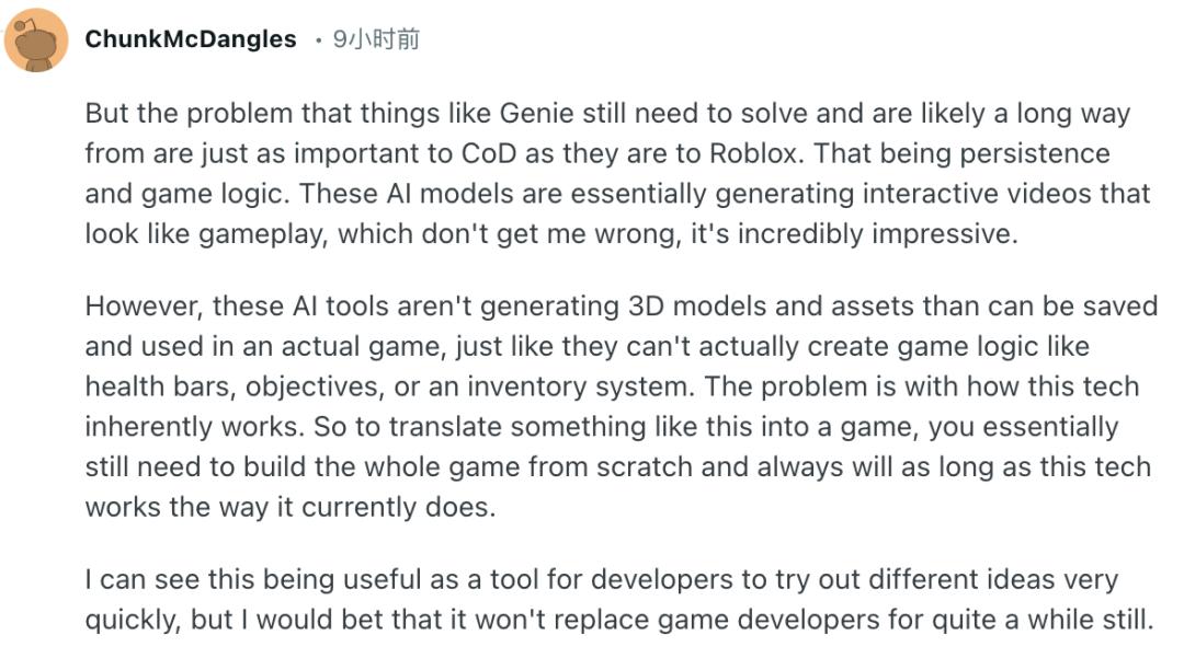 网友ChunkMcDangles认为,虽然Genie 3的能力令人震撼,但在相当长一段时间,它还不足以取代真正的游戏开发者:
