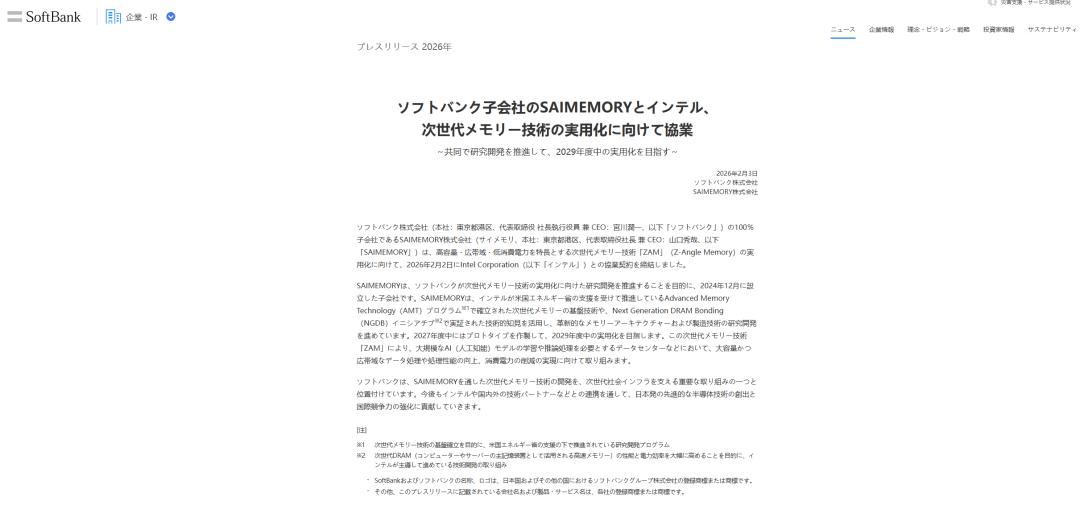 人工智能(AI)基础设施建设正助力掀起一轮存储“超级周期”,投资巨头和科技巨头正在争先布局这一赛道。软银集团周二表示,其子公司Saimemory已与英特尔公司达成合作,共同开发一种新型存储芯片技术。