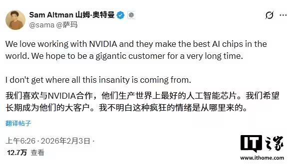 2月3日消息,OpenAI 首席执行官萨姆・奥尔特曼(Sam Altman)今日在 X 平台(前身为推特)发文称:“我们喜欢与英伟达合作,他们生产世界上最好的人工智能芯片。我们希望长期成为他们的大客户。我实在搞不懂这些毫无根据的疯狂传言是从哪里来的。”