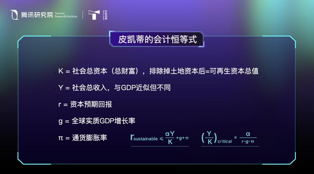 K 是资本,R 是回报率,Y 是社会年度总收入(约等于GDP,但是 完全不一 样),α 是资本在收入中的份额。这本质上是一个会计恒等式。在过去 200 年的统计中,资本回报率长期高于 GDP 增长率。原因有两个:第一,资本投资技术进步,推动生产力提升;第二,资本通过技术替代劳动力,获取原本属于劳动力的份额。
