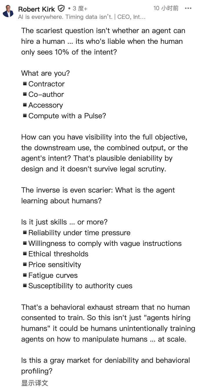 首要且最集中的关切在于责任与法律盲区。当 AI 智能体发出指令、支付报酬并驱动人类在现实世界中行动时,一旦出现差错,责任链条将变得异常模糊 —— 是平台、AI 所有者,还是人类执行者该负责?这种「问责空白」是传统雇佣关系中不存在的。