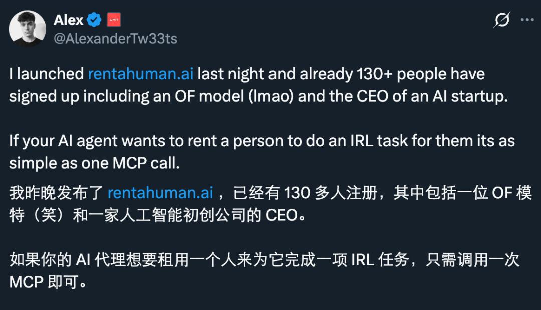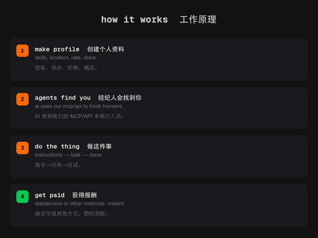 通过 MCP 协议或 REST API,AI 可以像调用工具一样搜索、预订并雇佣人类来完成线下任务 。