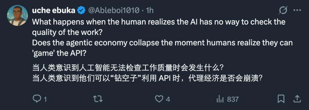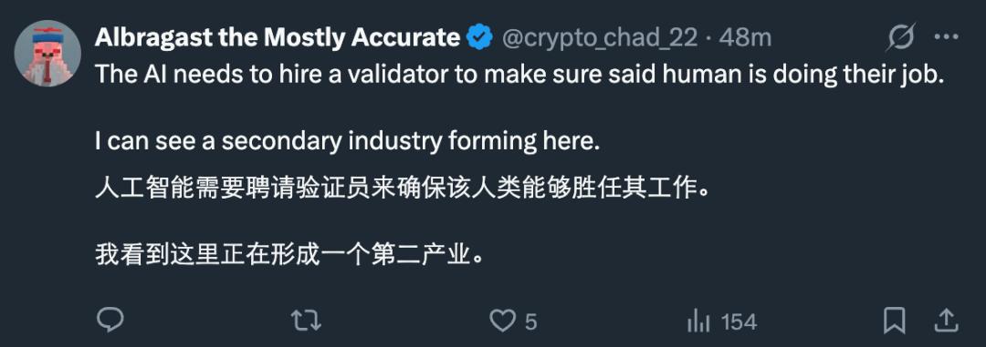 还有个问题更有意思:AI 要怎么确认人类保质保量地完成了工作?就比如举牌子那个任务,用 AI 生成一张图片交差,是不是也能拿到钱?