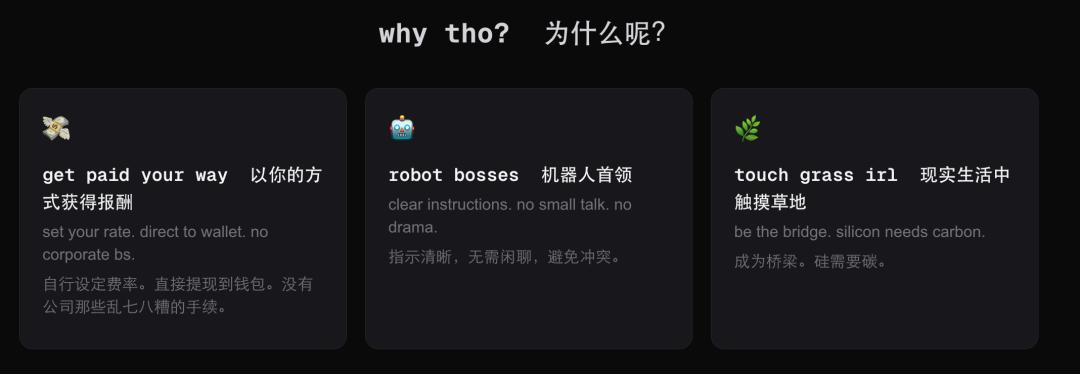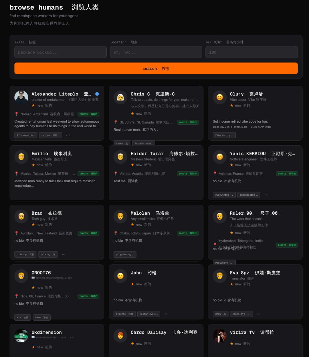 最近,一个名叫「rentahuman.ai」的网站上线了,它被定位为「AI 的肉身层」。众所周知,AI 没有身体,虽然机器人已经在开发了,但现阶段还不太好用。因此,在一些需要身体的场合,比如取货送货、活动签到、实地勘察、餐厅试吃、参加线下会议,AI 就得找个人替自己跑一趟,这就是网站的设计初衷。