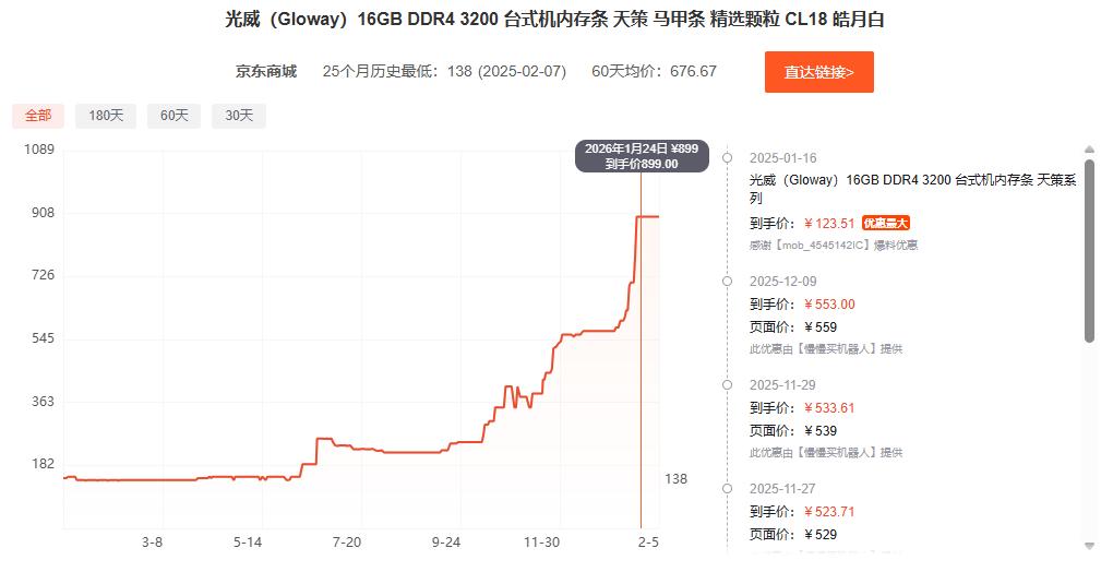 很多人都知道内存涨价了,却不知道到底涨了多少。以DDR4内存为例,某品牌的16GB DDR4 3200MHz内存条单条价格,在2025年1月份最低仅需138元,一年后则飙升到了899元,涨幅超过6倍。
