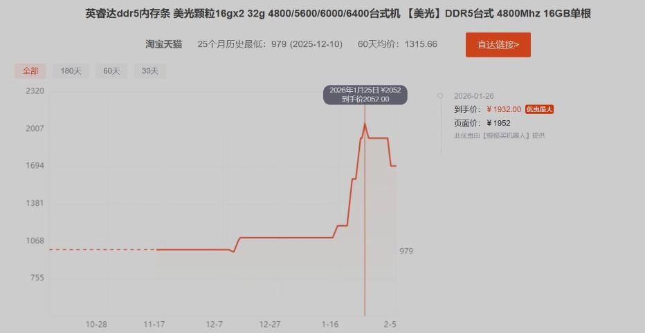 对于整个内存市场而言,这个信号带来的“降温”效果非常显著。小雷已经看到部分内存条的价格从3999元“闪崩”到3199元。其中,英睿达天猫旗舰店的DDR5 16G内存条,单根价格已经从1月25日的2000元(最高点)降到1699元。虽然还是很贵,却已然看到了降价的趋势。