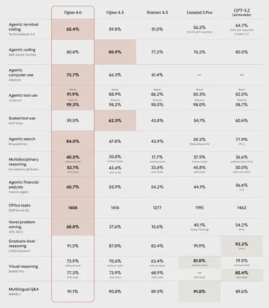 据Anthropic称,Opus 4.6在智能体编程、计算机使用、工具使用、搜索和金融领域均属行业领先,且通常具备显著优势,部分基准测试更是吊打业内对手。