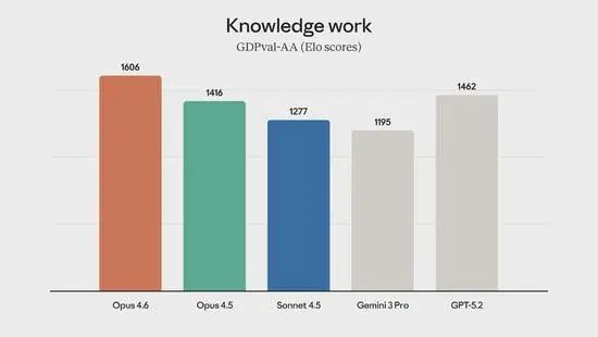 在衡量金融、法律等高价值知识工作任务的指标GDPval-AA上,Opus 4.6展现出了惊人的统治力:比前代Opus 4.5提升了190个Elo分;比竞争对手OpenAI的GPT-5.2更是高出约144个Elo分。