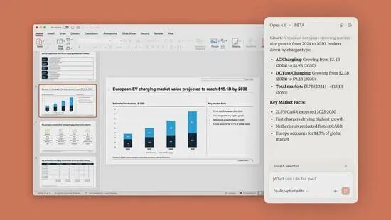 Anthropic深知,金融和知识工作者的战场在Office家族。Opus 4.6的Excel插件以及PPT插件能自动推断乱七八糟的表格逻辑,甚至能读取你的公司PPT母版和字体,直接生成一份符合品牌要求的路演PPT。