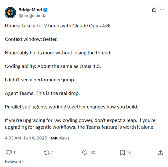 不少早期用户也都提到,Opus 4.6的长会话能力大幅提升,智能体团队是亮点。网红博主@bridgemindai直播2小时测试后总结道:“Opus 4.6的上下文窗口更好,明显能容纳更多内容而不丢失主线;智能体团队是真正的亮点,并行工作的各个智能体彻底改变了构建工作流的方式。”但他也提到,Opus 4.6的编程能力与Opus 4.5大致相同,没有发现性能飞跃。