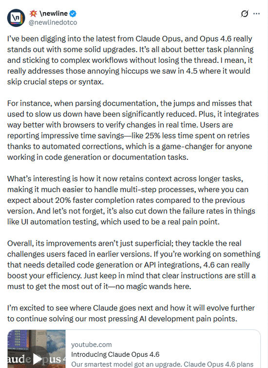 AI博主@newlinedotco在深度体验Opus 4.6后认为,Opus 4.6确实解决4.5版本中遇到的那些令人烦恼的“小故障”(比如跳过关键步骤或语法错误),改进并非浮于表面。