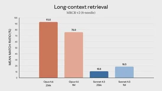 最令产品界兴奋的是它对“上下文崩塌”的改善。很多大模型在对话拉长后会变得“痴呆”,但在MRCR v2(针尖测试)中,Opus 4.6在100万Token的深海里依然能保持76%的精准提取率,而同门师弟Sonnet 4.5仅有18.5%。