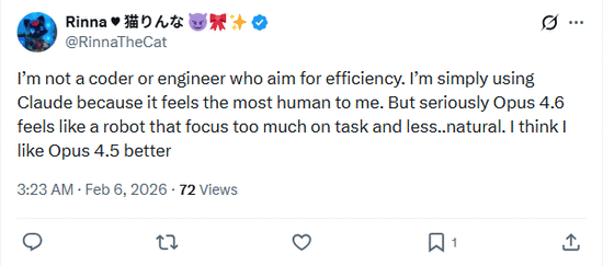 但设计师@RinnaTheCat直观感受新版Opus缺少人性化,认为“Opus 4.6更像个机器人,它过于专注任务,却少了一些...自然。我想我还是更喜欢Opus 4.5一些。”