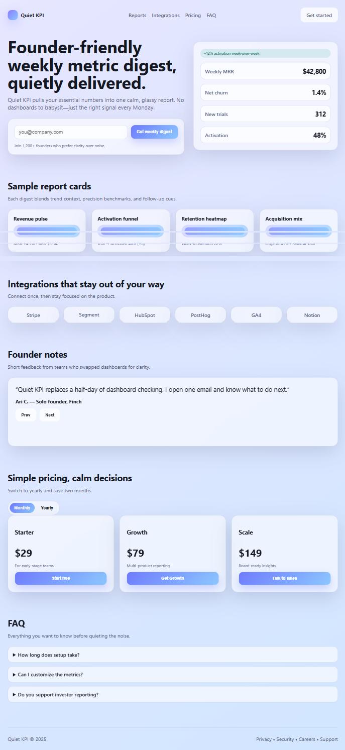为Quiet KPI构建一个落地页,这是一个对创始人友好的每周指标摘要。美学风格采用柔和的SaaS风,玻璃质感卡片,薰衣草色到蓝色的渐变,微妙的模糊效果。板块包括:带有邮箱收集的首屏,示例报告卡片网格,集成列表行,客户证言轮播,月付/年付价格切换,常见问题解答,页脚。