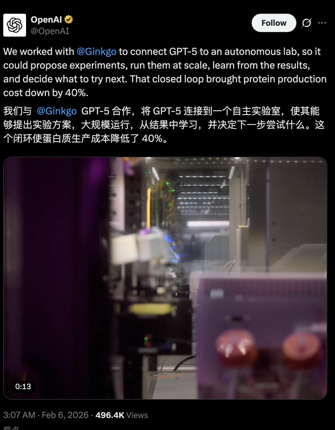 这是一家做合成生物学的实验室型公司,他们将GPT-5接入一座自主实验室,让模型可以提出实验方案、规模化执行实验、从结果中学习,并决定下一步该尝试什么,完整跑通了一个闭环。