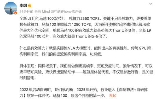 凤凰网科技讯 2月9日,理想汽车CEO李想通过社交媒体披露,全新L9车型搭载的马赫100双芯片总算力达2560TOPS。他强调,相比总算力更应关注单颗有效算力,并称马赫100因采用数据流架构,单颗有效算力为英伟达Thor U的3倍,而L9的双马赫100芯片,有效算力可达Thor U的5至6倍。