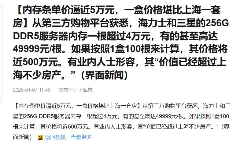 256GB DDR5服务器内存条价格突破5万元,单条内存价格能买上海一平米的房产。华强北的16GB DDR4内存条从180元飙升至420元,商户坦言“一天一个价”。与此同时,三星、SK海力士、美光三大原厂2026年产能均已“售罄”,长期协议(LTA)成为云巨头锁定供应的新常态。