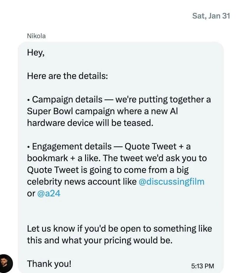 一些 X 博主分享,他们在一周前收到了一封邮件,请求推广一条 OpenAI 硬件预告的推文,还附上了 1000 多美元的报酬;一位商业媒体编辑还指控,有一篇报道这个假广告的虚假报道盗用了自己的名字。