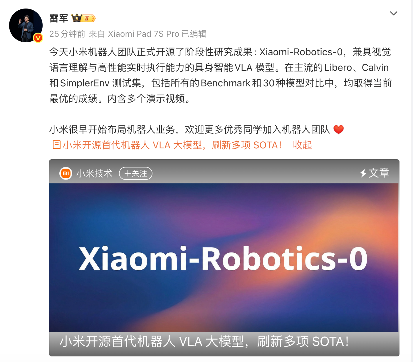 雷军表示“小米很早就开始布局机器人业务,并持续加大投入。我们会坚定推动技术开源、成果透明,更多的跟大家汇报业务进展。同时也欢迎相关领域的同学能够加入小米机器人团队。”