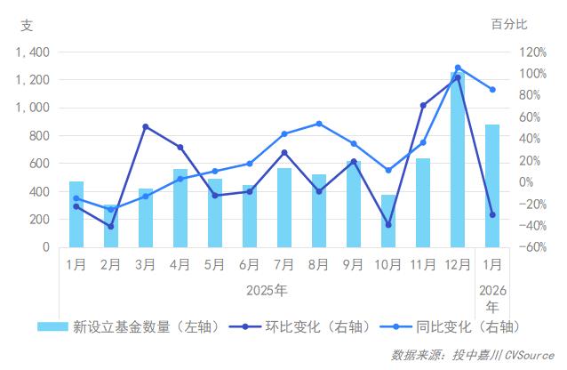 2026年1月,中国VC/PE市场新成立基金数量共计878支,较上月减少378支,环比减少30.1%。和去年同期相比增加404支,同比增加85.23%。
