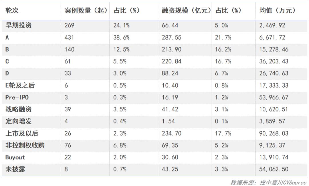 细分交易轮次,A轮以431起案例,占比38.6%,融资规模287.55亿元,占比21.7%,主导市场。同比去年,早期投资交易数量活跃度上升,成长期及上市及以后交易规模涨幅尤为显著。