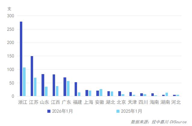 2026年1月,共计26个省市区(含港澳台)新设基金,设立地区分布更为广泛。其中,浙江省新设数量278支位居榜首,江苏省新设基金150支位居第二,山东省83支位居第三,整体来看基金地区更为集中化,区域活跃度差异愈发显著。