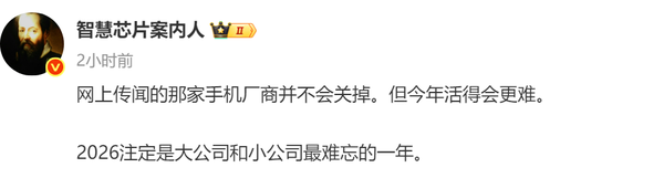 行业分析机构IDC发布的最新报告为这一趋势提供了数据支撑。报告显示,2026年中国智能手机市场出货量预计约为2.78亿台,同比下降2.2%。博主“数码闲聊站”此前透露,受内存等关键元器件涨价的冲击,主流TOP5手机厂商纷纷调整策略,基本都在下调2026年新机出货量。不过,其中有一家厂商选择逆势而上,内部目标设定为约7000万部,且中国区市场占据主导地位。