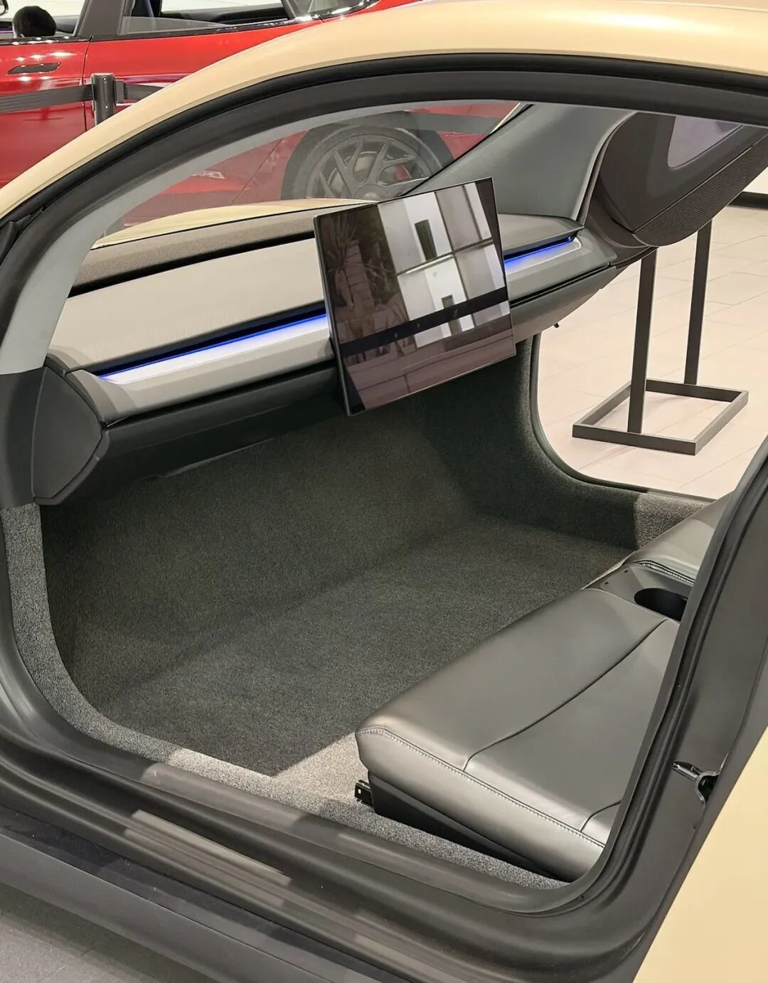 车内非常简洁,只有一块中控屏,取消了方向盘、加速和制动踏板