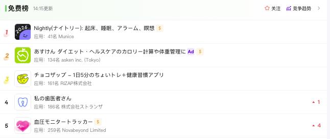 日本 iOS 健康健美下载榜,Top1 为 Nightly|图源点点数据