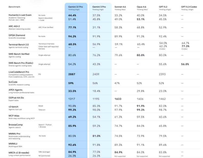 谷歌Gemini 3.1 Pro这次在ARC抽象推理和BrowseComp搜索任务上显著拉开差距,显示出明显的Agent倾向,而非单纯知识模型。