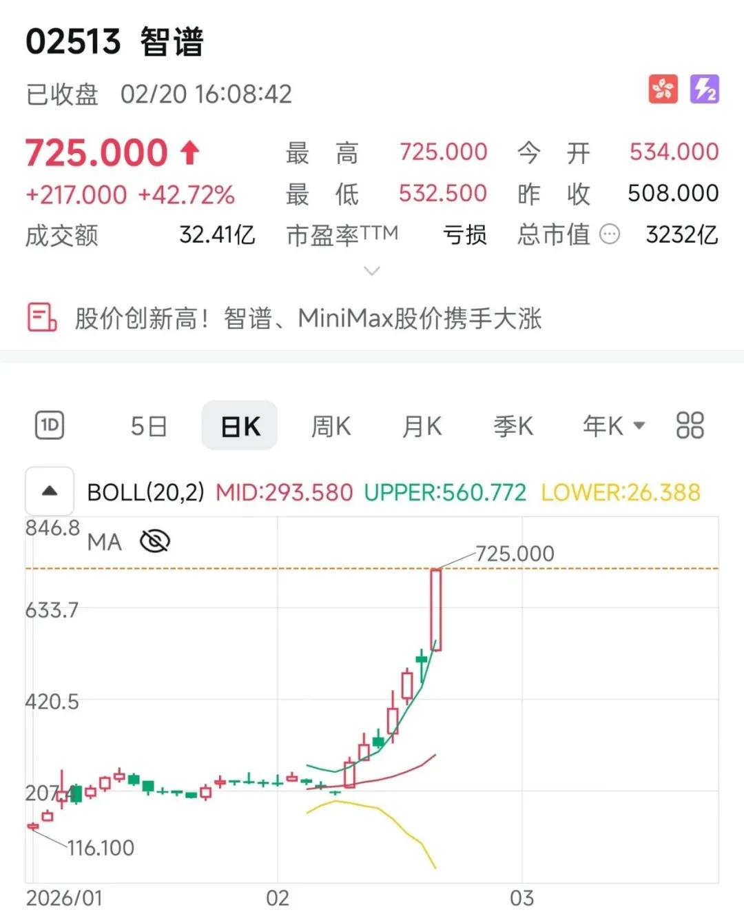 智谱却逆势走出暴涨行情,单日暴涨42.72%,收盘报725港元,总市值冲到3232亿港元。