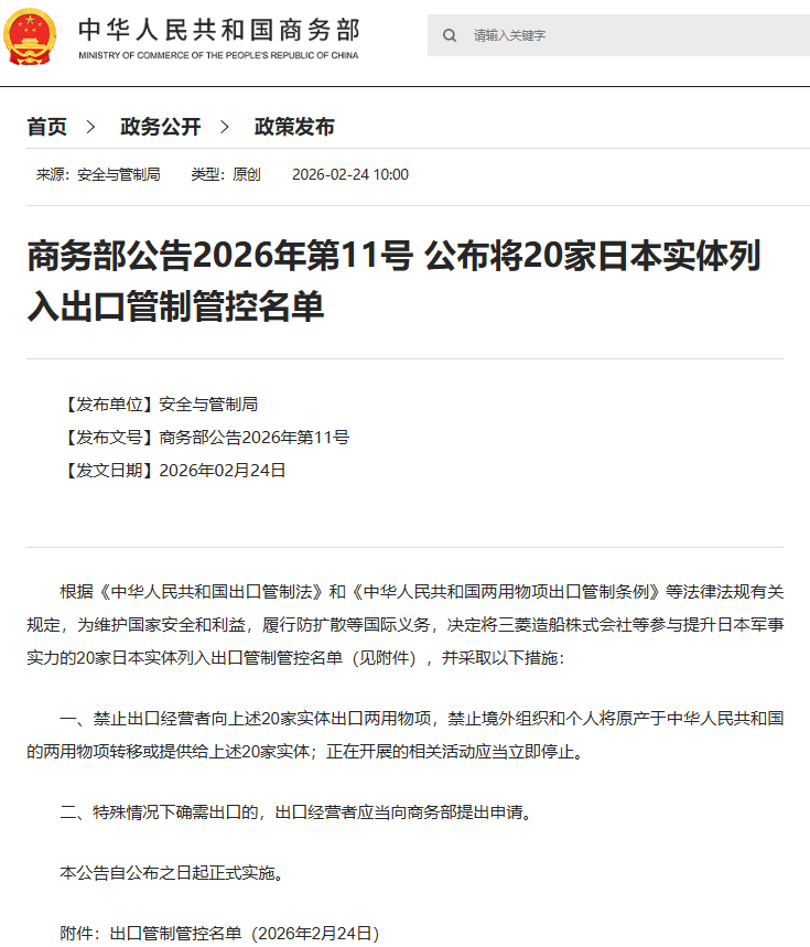 2月24日,商务部新闻发言人就对日相关出口管制措施答记者问。有记者提问称,2026年2月24日,商务部对外发布管控名单、关注名单,请问有何考虑?