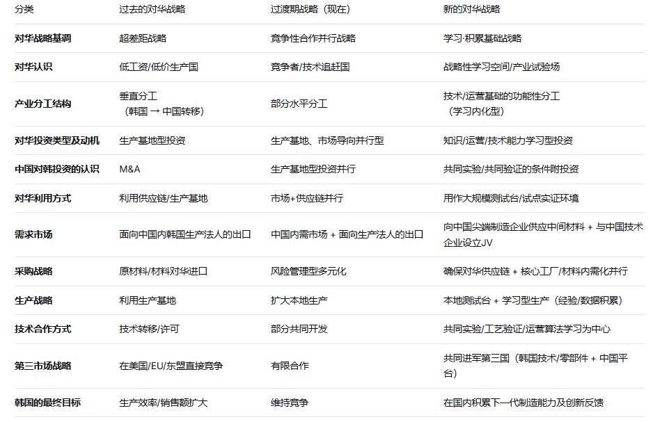 但如今这一战略的基础已然不复存在,韩国产业研究院提出应转向为"竞争性合作"与"战略性利用"。 韩国的产业政策不应回避竞争,而应转向在与中国的相互依存中,实现差异化竞争力和战略性利用,其核心不在于单纯降低对华依存度、克服对华逆差,而是从长期视角应对中国主导的全球供应链,并思考如何搭上便车以最大化韩国的国家利益。