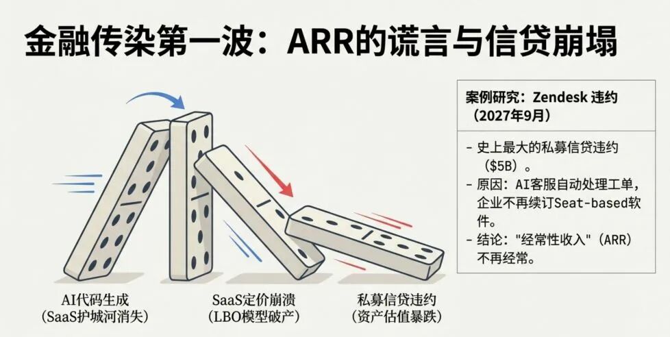 报告还假设,2027年全球知名CRM服务商Zendesk的50亿美元私募信贷违约,将成为史上最大规模的同类事件。直接原因在于AI客服替代人工后,企业不再续订相关软件,而这一事件会引发连锁反应:SaaS定价崩溃导致LBO模型破产,进而造成私募信贷违约、资产估值暴跌的恶性循环。